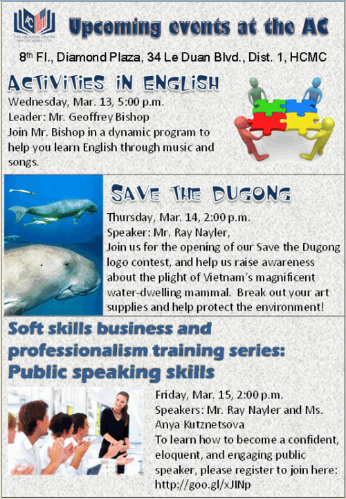 | Thứ sáu, 15/03/2013, 2:00 - 4:00 p.m. | Chuỗi tập huấn kỹ năng mềm: Kỹ năng thuyết trình | Ông Ray Nayler và Bà Anya Kutznetsova |