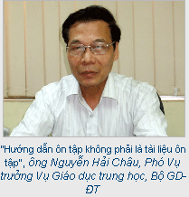 Ông Nguyễn Hải Châu, Phó Vụ trưởng Vụ Giáo dục trung học, Bộ GD-ĐT, cho biết như vậy khi trao đổi về hướng dẫn cho thí sinh ôn tập thi tốt nghiệp THPT năm 2009."Hướng dẫn ôn tập không phải là tài liệu ôn tập", ông Nguyễn Hải Châu, Phó Vụ trưởng Vụ Giáo dục trung học, Bộ GD-ĐT