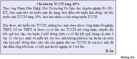 Ngay sau khi các sở GD-ĐT công bố kết quả thi tốt nghiệp THPT năm 2009, nhiều trường trung cấp bắt đầu thông báo tuyển những học sinh thi rớt tốt nghiệp vào học hệ trung cấp chuyên nghiệp (TCCN) chính quy. Nếu thời gian đào tạo dành cho người đã tốt nghiệp THPT là 2 năm thì các học sinh này thông thường phải học 2 năm 3 tháng. Trong đó, 3 tháng học văn hóa để hoàn thành chương trình học phổ thông. Khi tốt nghiệp hệ TCCN, học sinh hoàn toàn có thể học liên thông lên bậc CĐ, ĐH với ngành nghề rất đa dạng.