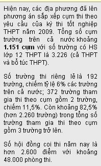 Có khoảng 1.140.000 thí sinh tham gia kỳ thi tốt nghiệp THPT năm 2009. Thí sinh tự do của THPT được phép đăng ký dự thi tốt nghiệp GDTX nhưng không được bảo lưu điểm thi như thí sinh tự do đã dự thi tốt nghiệp GDTX.Thứ trưởng Thường trực Bộ GD-ĐT Bành Tiến Long đã ký ban hành hướng dẫn tổ chức thi tốt nghiệp THPT năm 2009 ngày 9/4. Theo đó, hướng dẫn chỉ rõ phần mục các việc trong thi tốt nghiệp THPT như: đăng ký dự thi và tổ chức cụm trường; in sao đề thi; coi thi; chấm thi, phúc khảo và công nhận tốt nghiệp...