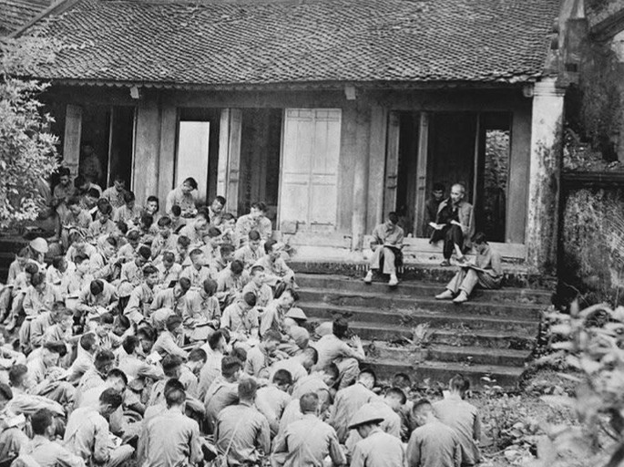 Ảnh: Chủ tịch Hồ Chí Minh nói chuyện với cán bộ Đại đoàn Quân Tiên phong tại Đền Hùng năm 1954: “Các Vua Hùng đã có công dựng nước, bác cháu ta phải cùng nhau giữ lấy nước... ”