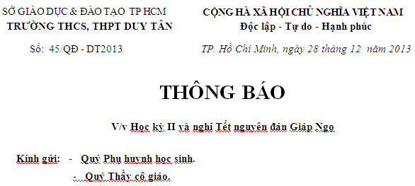 Thực hiện kế hoạch năm học 2013 – 2014 của Sở Giáo Dục & Đào Tạo Tp HCM cho Học kỳ II và nghỉ Tết nguyên đán Giáp Ngọ. Nhà trường xin thông báo như sau: