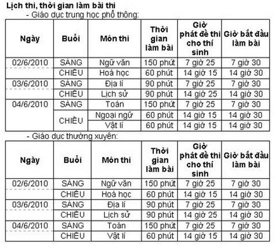 Trước ngày 20.5.2010, các sở GD-ĐT gửi đến các trường phổ thông thẻ dự thi của TS đăng ký dự thi tại trường. Hiệu trưởng trường phổ thông rà soát, xác nhận tính chính xác của các thông tin liên quan rồi niêm yết các danh sách để thông báo cho TS; ký tên, đóng dấu vào thẻ dự thi, đóng dấu giáp lai vào ảnh trên thẻ và phát cho TS. Bộ GD-ĐT lưu ý: Mỗi TS có một số báo danh gồm 6 chữ số: 2 chữ số đầu là mã số cụm trường; 4 chữ số sau là số thứ tự của TS trong danh sách, đánh từ 0001 đến hết số TS của cụm trường.