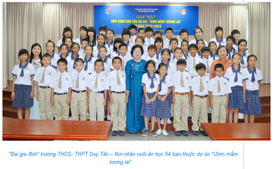 Trước hết là chương trình học bổng Vừ A Dính và tấm lòng của các phụ huynh học sinh trường Duy Tân khi chúng tôi xem những thước phim giới thiệu và những điều cụ thể trên thông tin báo chí, nhiều em dân tộc miền núi đi học lội sông lội suối, bão lũ dồn dập, điều kiện học tập rất khó khăn, thiếu trường, thiếu giáo viên. Chúng tôi đã họp HĐQT, BGH và Ban liên lạc PHHS, thành lập Quỹ học bổng Duy Tân đồng hành với Quỹ học bổng Vừ A Dính. Từ năm 2009 đến nay chúng tôi đã tiếp nhận mỗi năm 10 em, có năm 15 em, đến nay tổng cộng là 64 em với mong muốn chung tay cùng với các đồng bào dân tộc đào tạo các em trở thành giáo viên, những cán bộ quản lý theo tiêu chuẩn giáo dục cao ở môi trường học tập tốt như TPHCM, để sau này tốt nghiệp ra trường, các em trở về góp phần xây dựng quê hương. Ban đầu các em cũng có những khó khăn trong các môn học ngoại ngữ, tin học, nhưng với tuổi trẻ dễ hòa nhập, các em đã mau chóng theo kịp bạn bè.