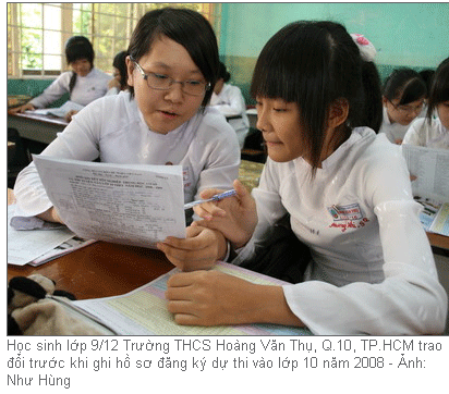 - Năm nay, HS tốt nghiệp THCS vẫn được chọn ba nguyện vọng (NV) vào lớp 10 trường công lập bình thường và bốn NV vào trường chuyên. Trước khi làm hồ sơ, HS sẽ được phát bảng “Hệ thống trường lớp tuyển sinh lớp 10 năm học 2009-2010”, bảng điểm chuẩn tuyển sinh lớp 10 của năm học trước (2008-2009). Căn cứ vào bảng điểm chuẩn này, có thể chia các trường THPT công lập thành bốn tốp: tốp 1: có 16 trường, điểm chuẩn 35 trở lên; tốp 2: 15 trường, điểm chuẩn từ 30-34,75; tốp 3: 17 trường, điểm chuẩn từ 25-29,75; tốp 4: 16 trường, điểm từ 24,75 trở xuống.